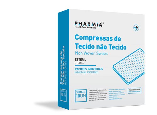 Compresas Pharmia de Tejido no tejido de 10x10 cm. Están compuestas por 30g/m2 de viscosa y poliéster, con 4 capas y esterilizadas por vapor a 134ºC. Caracterizadas por su suavidad y escasa capacidad de abrasión. Sin látex ni ftalatos. Uso no quirúrgico para compresión, absorción de exudados o manejo de heridas y quemaduras menores o heridas crónicas. Caja de 10.
